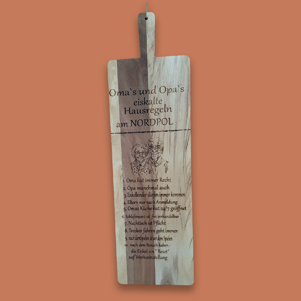 Dieses großzügige Servierbrett mit einer laserbaren Fläche von bis zu 29 × 82 cm ist der perfekte Blickfang für jede Tafel. Ideal zum Anrichten, Schneiden oder Präsentieren – und das Schönste: Die Enkel dürfen bestimmen, was die Großeltern darauf lesen! So wird jedes Brett zu einem ganz persönlichen Unikat voller Liebe und Familiengeschichte.